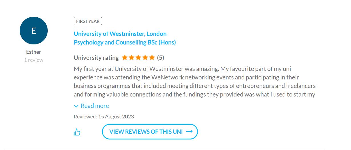 All reviews are listed on Whatuni’s 'Read reviews' page. You can use the search and filter bars at the top of the page to find specific institution course reviews. You can also filter by keywords, meaning your search results will only show reviews that mention specific things.
